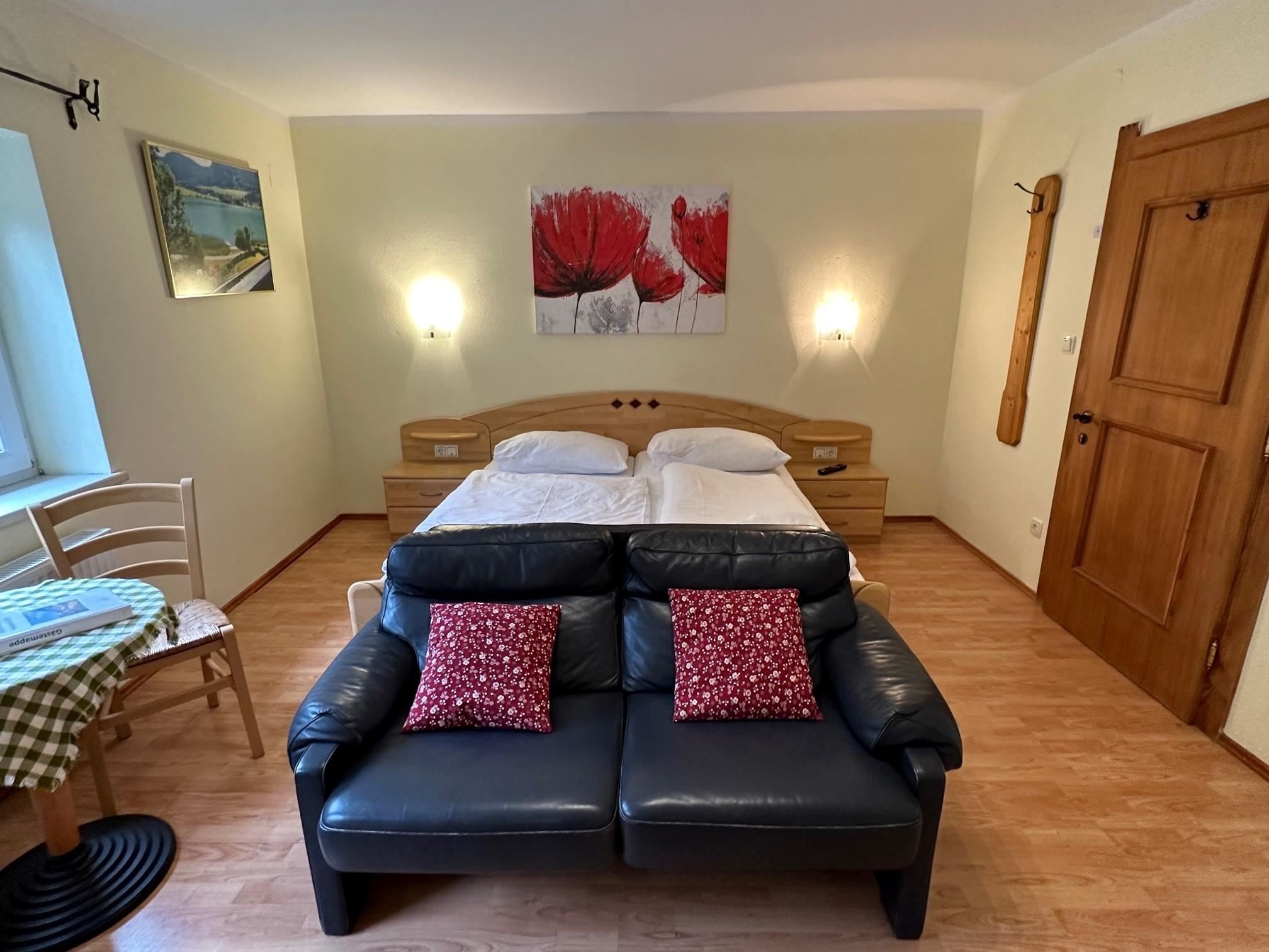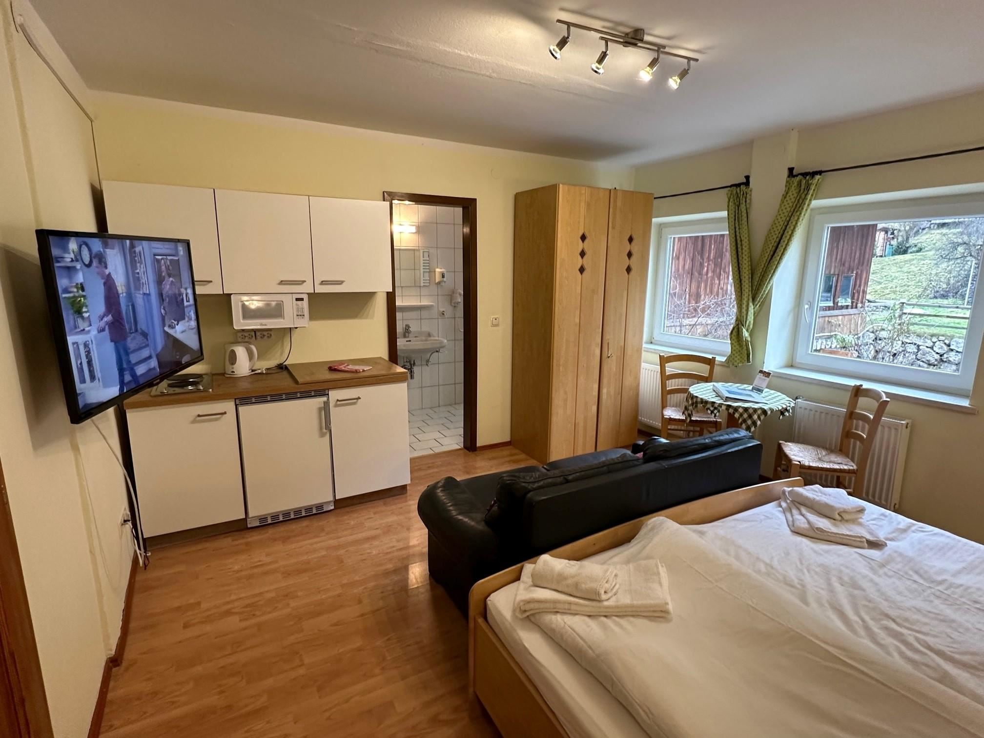Das gemütliche Wohn- Schlafzimmer verfügt über ein komfortables Doppelbett, eine Küchenzeile und bietet Staumöglichkeiten für Ihr Reisegepäck. Sie finden ein modernes und adäquat ausgestattetes Badezimmer mit Dusche, WC und Haartrockner vor.