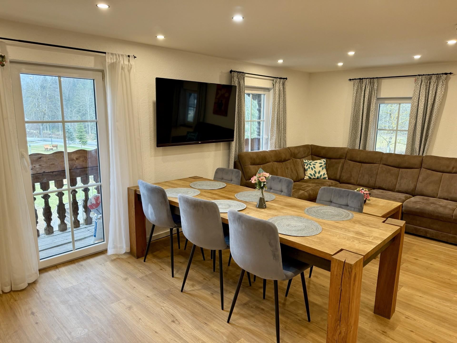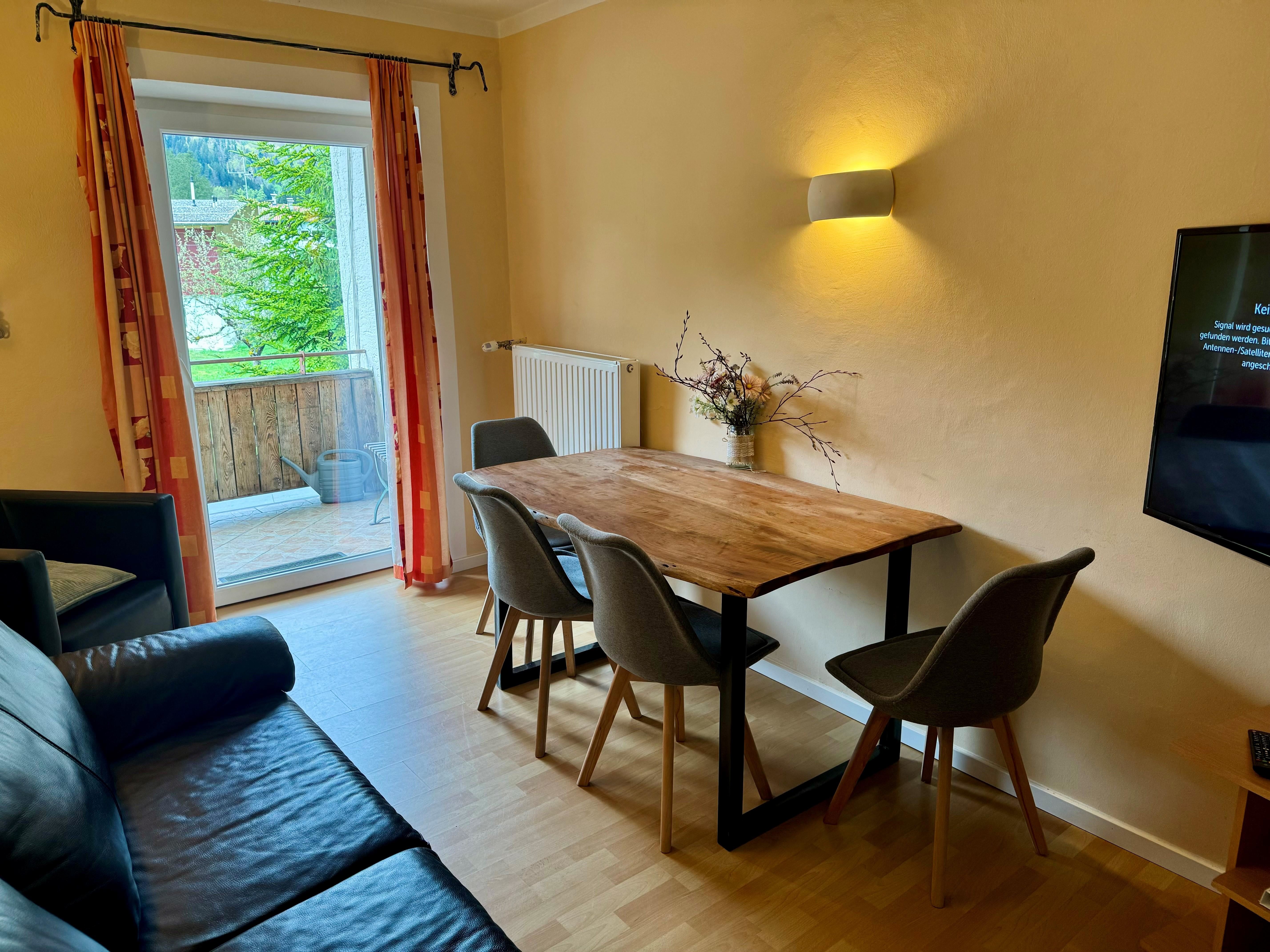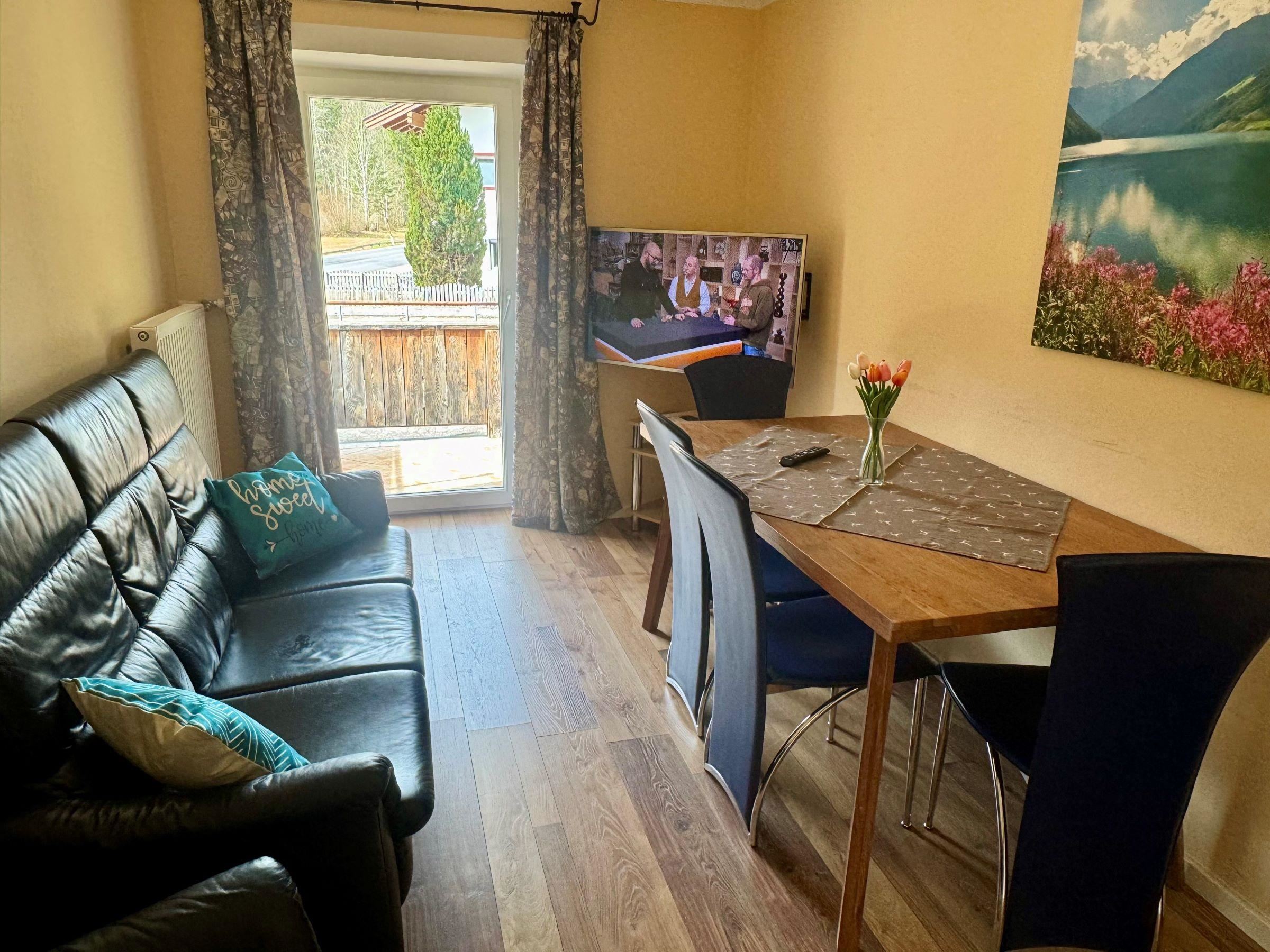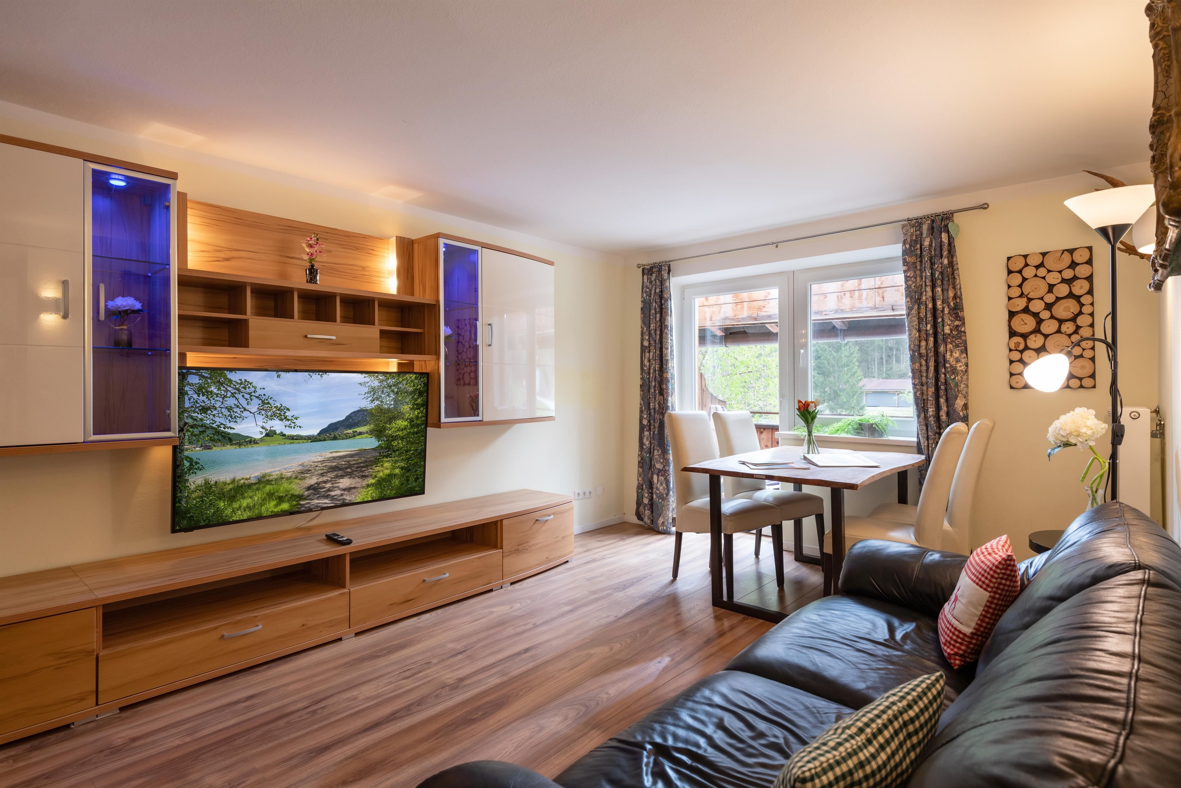 Die beiden gemütlichen Schlafzimmer verfügen jeweils über ein komfortables Doppelbett und in einem Schlafzimmer gibt es ein zusätzliches Einzelbett. Im lichtdurchfluteten Wohnzimmer mit Sofa, Flachbildfernseher, gemütlicher Essecke und offener Wohnküche könnt ihr nicht nur bei schlechtem Wetter verweilen. Gratis WLAN steht Ihnen hier und im gesamten Haus zur Verfügung. Die moderne Wohnküche ist voll ausgestattet. Zur Wohnung gehört eine private, eingezäunte Terrasse mit Whirlpool, Sitzlounge und Esstisch mit einmaligem Panoramablick auf die Tiroler Alpen.