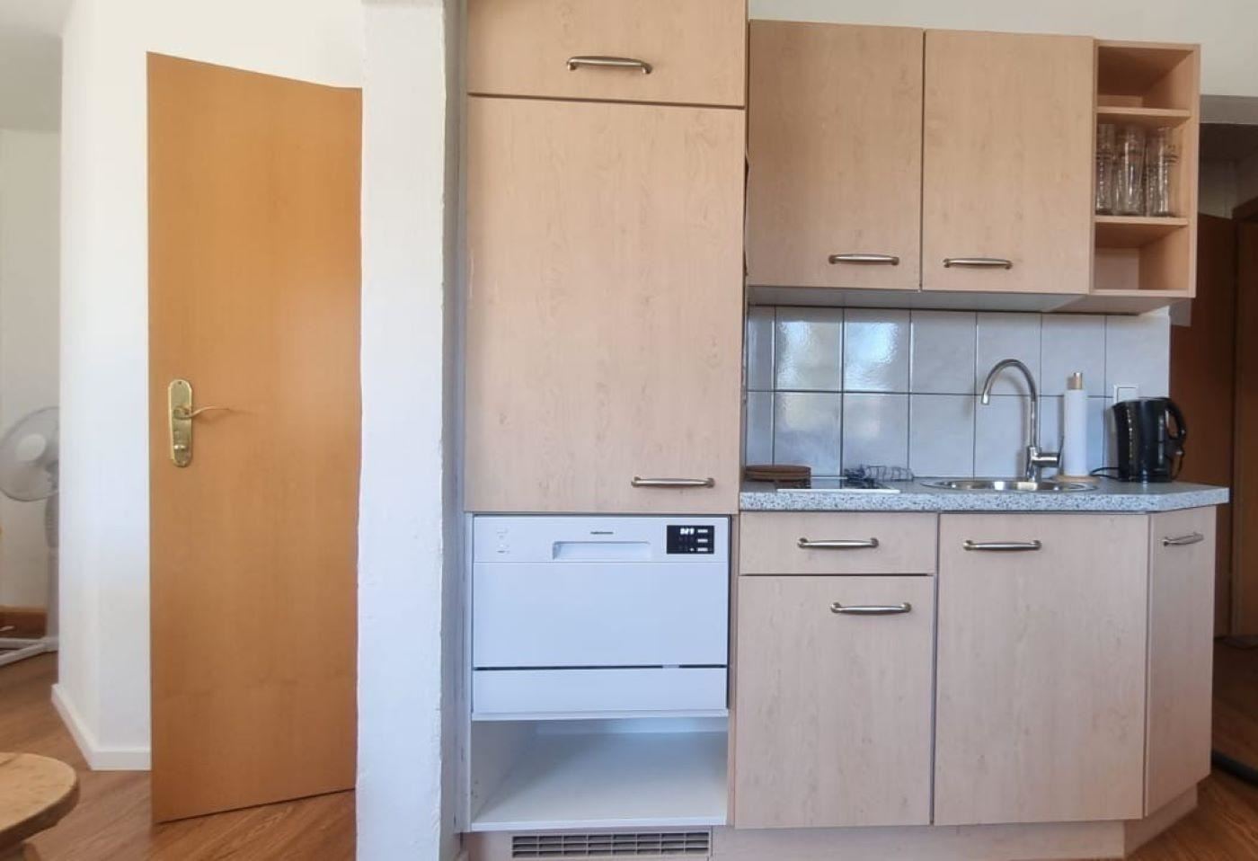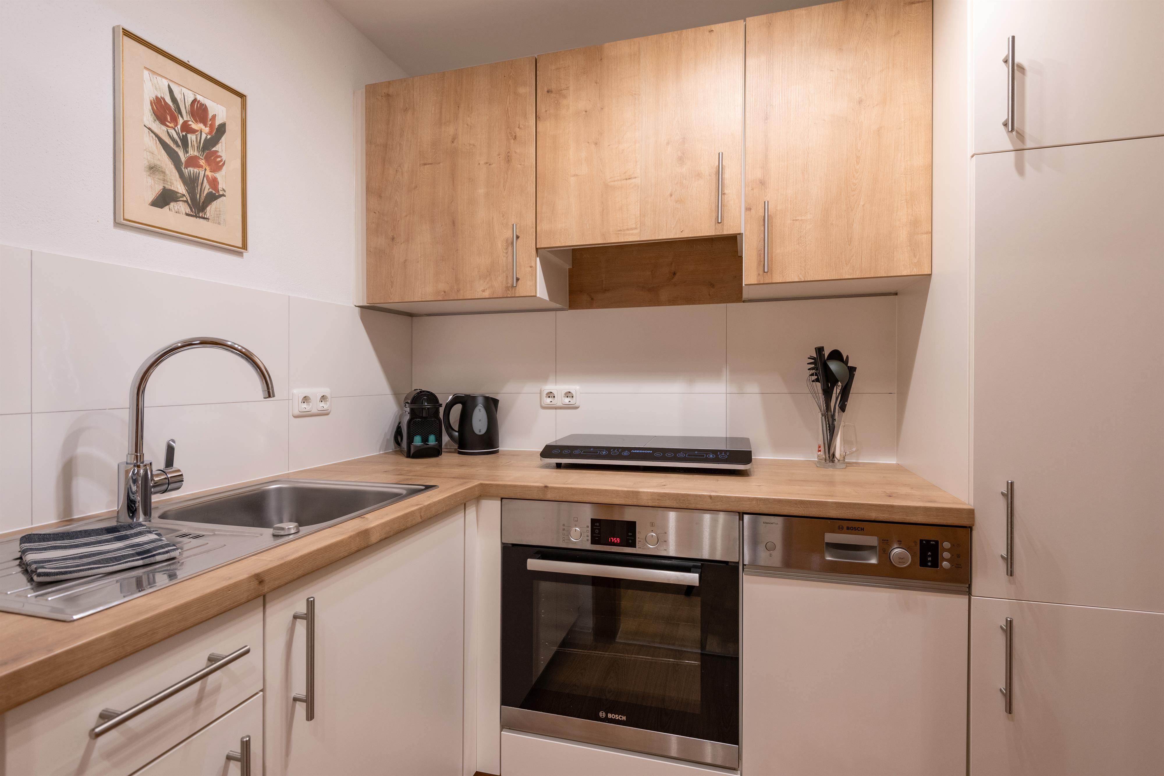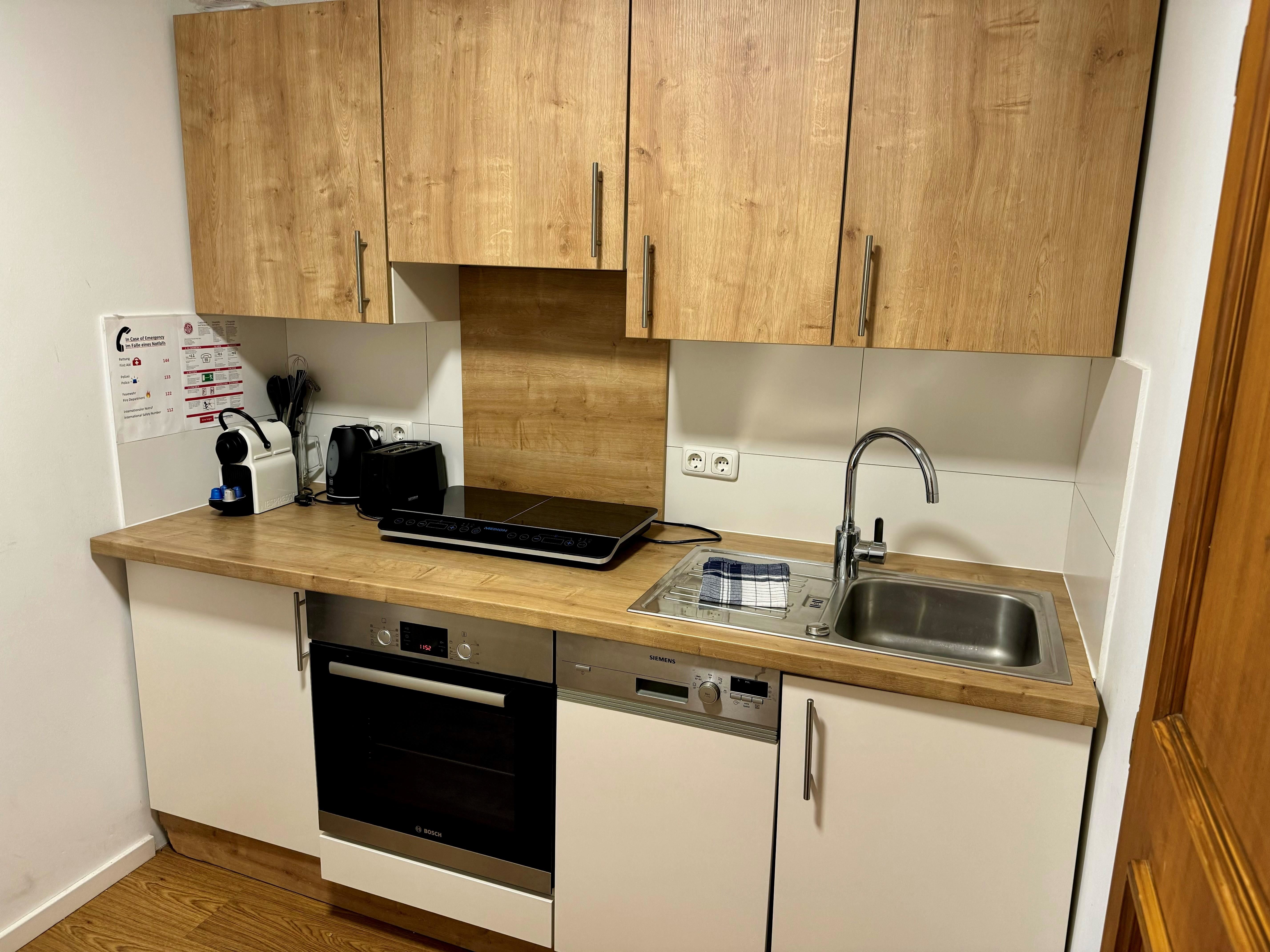 Das gemütliche Schlafzimmer verfügt über ein komfortables Einzelbett und bietet Staumöglichkeiten für Ihr Reisegepäck. Die moderne und ausgestattete Küchenzeile verfügt über einen E-Herd, einen Kühlschrank mit Gefrierfach, einen Wasserkocher, eine Nespressomaschine, einen Toaster und Geschirr. Sie finden ein modernes und adäquat ausgestattetes Badezimmer mit Dusche, WC und Haartrockner vor.