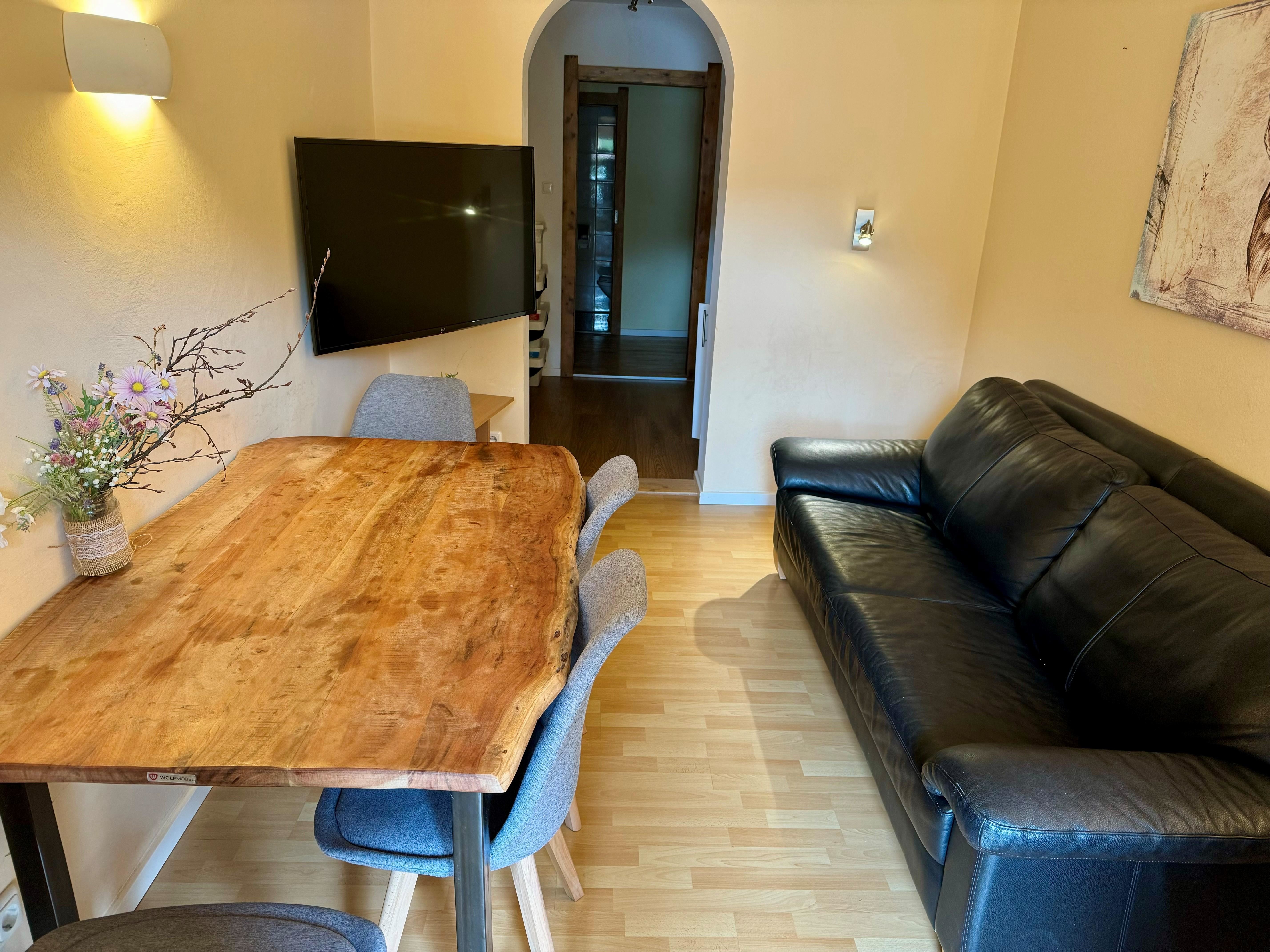Das gemütliche Schlafzimmer verfügt über ein komfortables Doppelbett und bietet großzügige Staumöglichkeiten für Ihr Reisegepäck. Im lichtdurchfluteten Wohnzimmer mit ausziehbarem Ledersofa, Medienbereich mit Flachbildfernseher und gemütlicher Essecke können Sie nicht nur bei schlechtem Wetter verweilen. Gratis WLAN steht euch hier und im gesamten Haus zur Verfügung. Die moderne und voll ausgestattete Küche verfügt u.a. über eine Spülmaschine, einen Backofen, einen E- Herd, einen Kühlschrank mit Gefrierfach, einen Wasserkocher, eine Nespressomaschine, einen Toaster und Geschirr. Sie finden ein modernes und adäquat ausgestattetes Badezimmer mit Dusche, WC und Haartrockner vor. Vom Schlafzimmer und vom Wohnbereich aus erreichen Sie Ihren eigenen, überdachten Balkon, mit einmaligem Panoramablick auf die Tiroler Alpen.