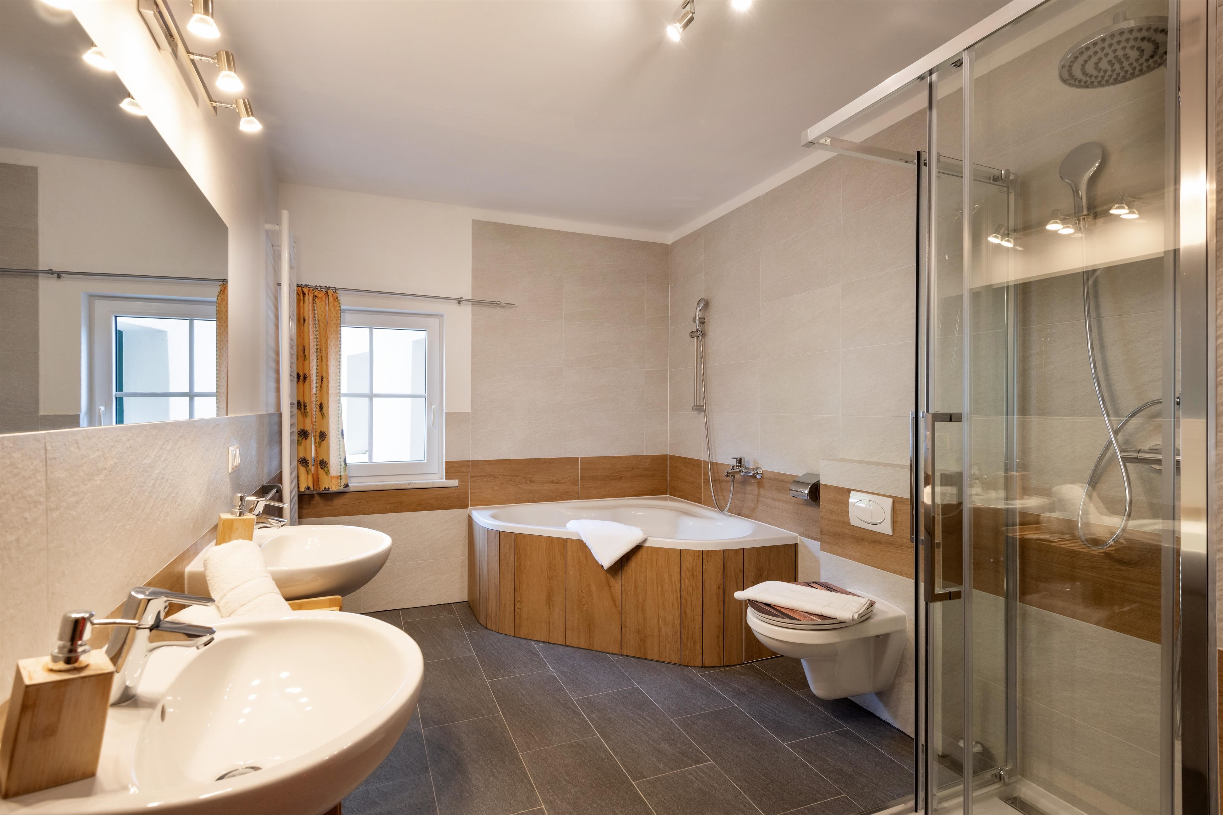 Die beiden gemütlichen Schlafzimmer verfügen jeweils über ein komfortables Doppelbett und bieten Staumöglichkeiten für euer Reisegepäck. Im lichtdurchfluteten Wohnzimmer mit Ledersofa, Medienbereich mit Flachbildfernseher, gemütlicher Essecke und offener Wohnküche könnt ihr nicht nur bei schlechtem Wetter verweilen. Gratis WLAN steht euch hier und im gesamten Haus zur Verfügung. Die moderne und voll ausgestattete Wohnküche verfügt u.a. über eine Spülmaschine, einen Backofen, einen E-Herd, einen Kühlschrank mit Gefrierfach, einen Wasserkocher, eine Nespressomaschine, einen Toaster und Geschirr. Ihr findet zwei modern und adäquat ausgestattete Badezimmer vor. Ein Badezimmer verfügt über eine Dusche, ein WC, ein Wachbecken und einen Haartrockner und das andere Badezimmer bietet Ihnen eine Badewanne und ein weiteres WC. Von beiden Schlafzimmern und vom Wohnbereich aus erreicht ihr euren eigenen, überdachten Balkon, mit einmaligem Panoramablick auf die Tiroler Alpen.