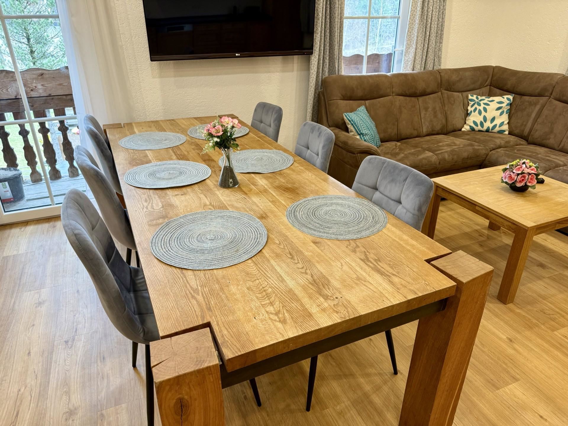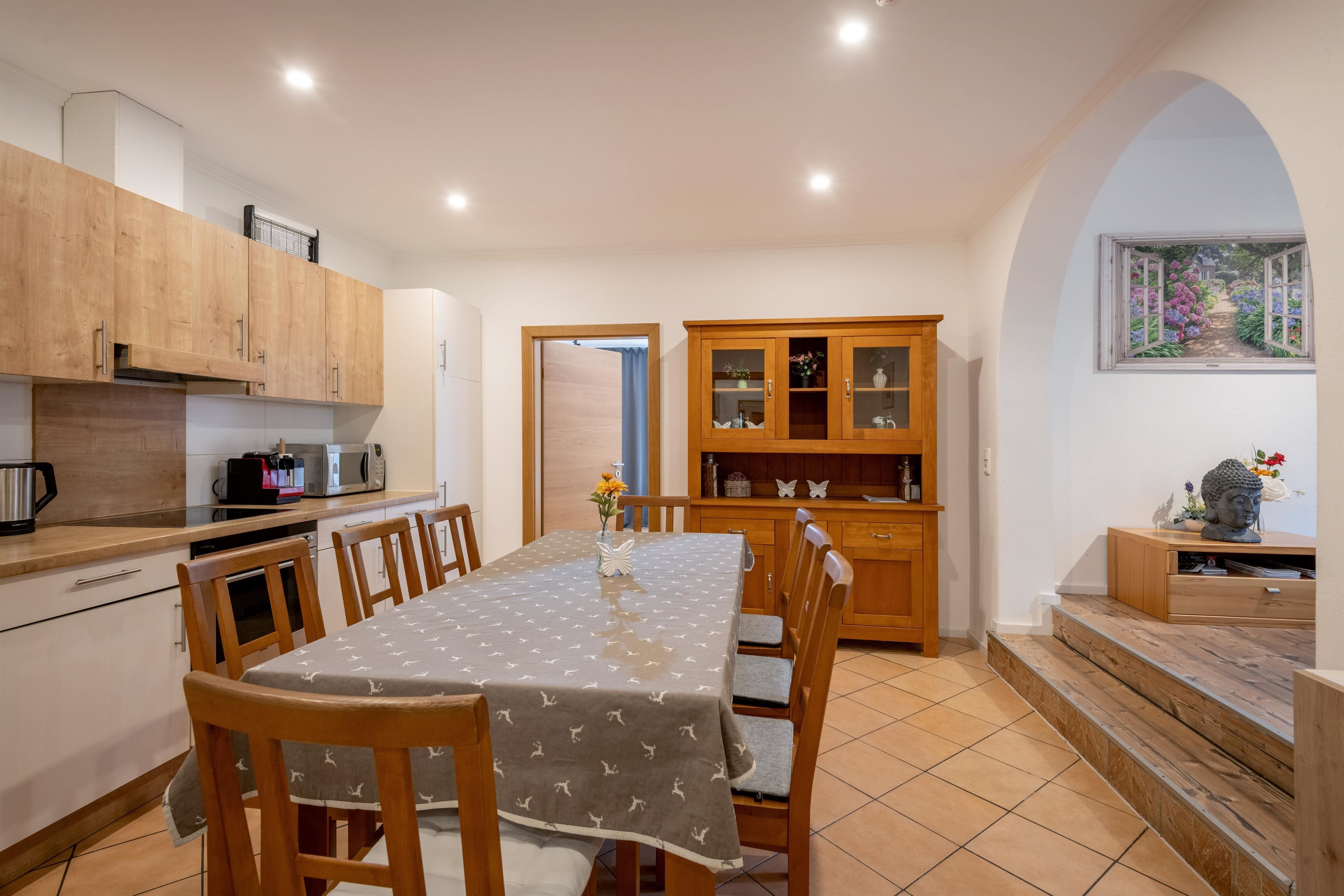 Die Ferienwohnung bietet euch drei gemütliche Schlafzimmer mit jeweils einem komfortablen Doppelbett und großzügigen Staumöglichkeiten für euer Reisegepäck. Eins der Schlafzimmer verfügt über ein besonderes Himmelbett. Im lichtdurchfluteten, großzügigen Wohnzimmer mit Ledersofa, Lederliege, Ledersessel und einem Medienbereich mit Flachbildfernseher könnt ihr nicht nur bei schlechtem Wetter verweilen. Der Elektrokamin sorgt für eine gemütliche Stimmung. Die moderne und ausgestattete Wohnküche verfügt u.a. über einen E-Herd, einen Ofen, eine Spülmaschine einen Kühlschrank mit Gefrierfach, einen Wasserkocher, einen Toaster, eine Nespressomaschine, Geschirr und einen großzügigen Essbereich für die ganze Familie. Ihr findet ein modernes Badezimmer mit Dusche, Eckbadewanne, WC, zwei Waschbecken, einer privaten Infrarotsauna, Waschmaschine und Haartrockner vor. Angrenzend an ein Schlafzimmer gibt es ein zweites kleines Badezimmer mit Dusche, Waschbecken und separatem WC.