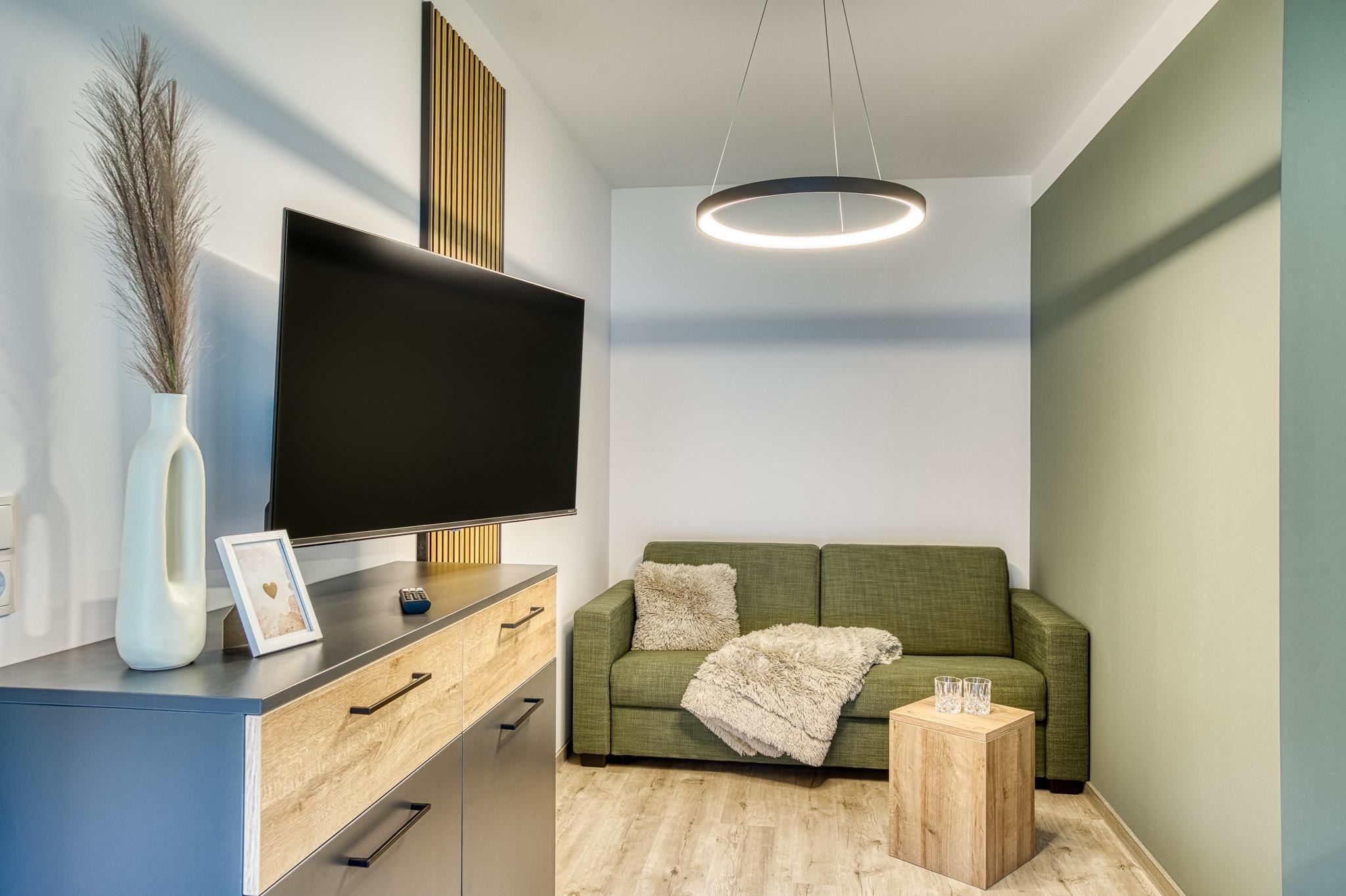 This approximately 58 m² apartment with a separate bedroom and sofa bed for up to 2 children features a balcony with seating and a cozy, modern decor. It offers a comfortable queen-size bed, a practical kitchenette with a ceramic cooktop, oven, dishwasher, and capsule coffee machine (including 10 capsules), as well as a stylish bathroom with a shower. Amenities such as a flat-screen TV, Wi-Fi, desk/dining table, wardrobe, safe, and a cozy upholstered chair provide additional comfort.