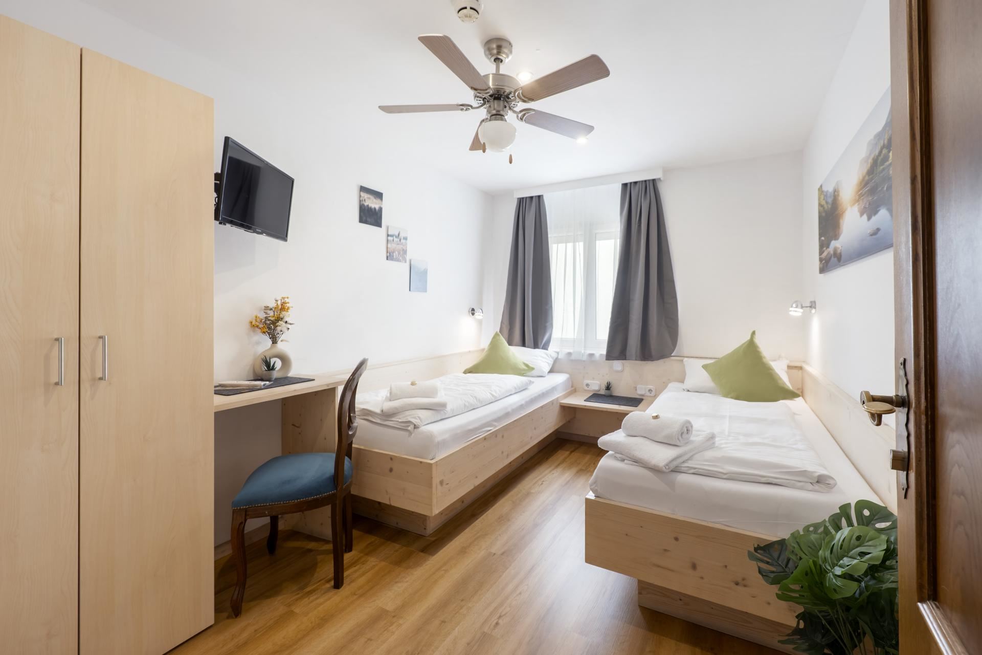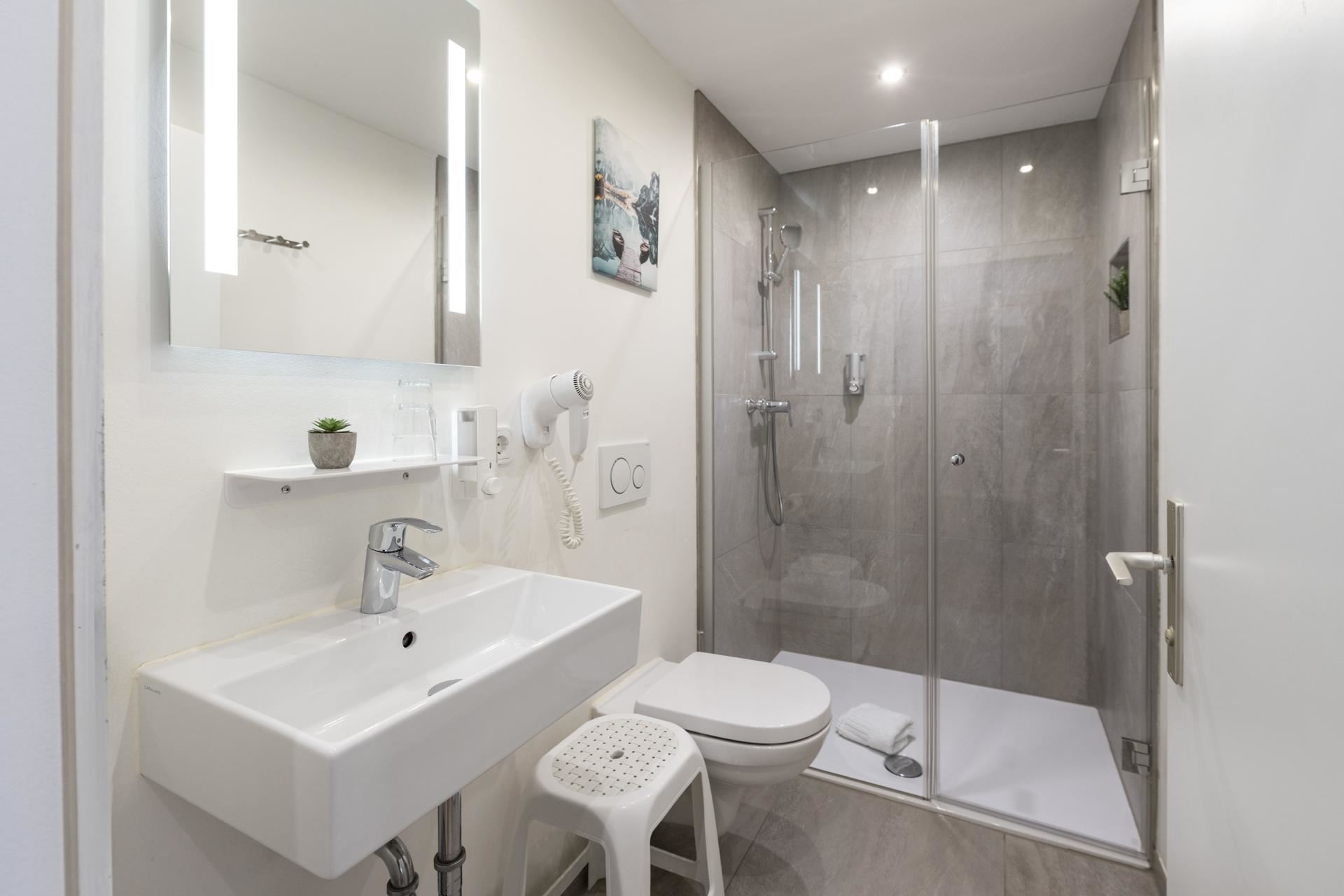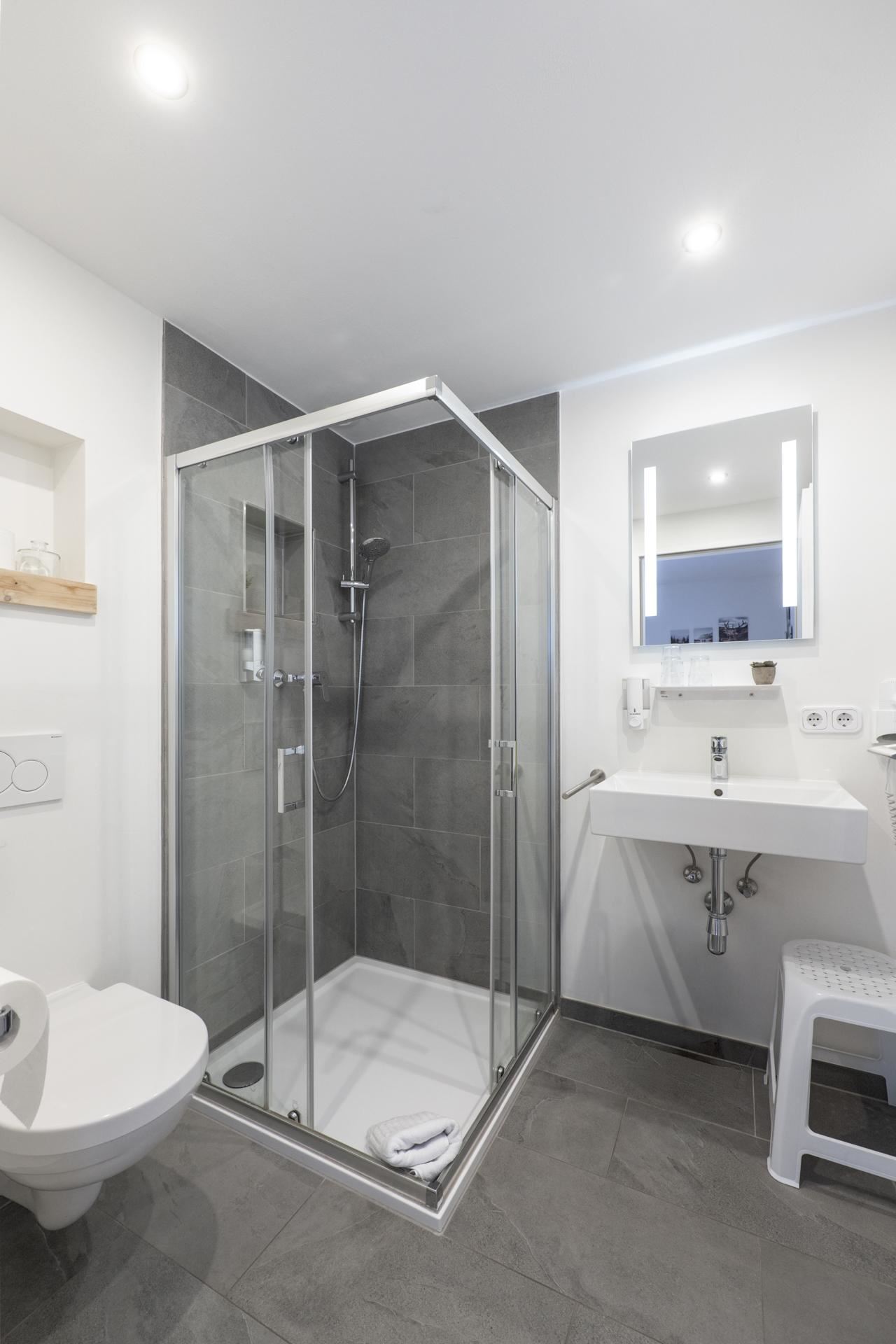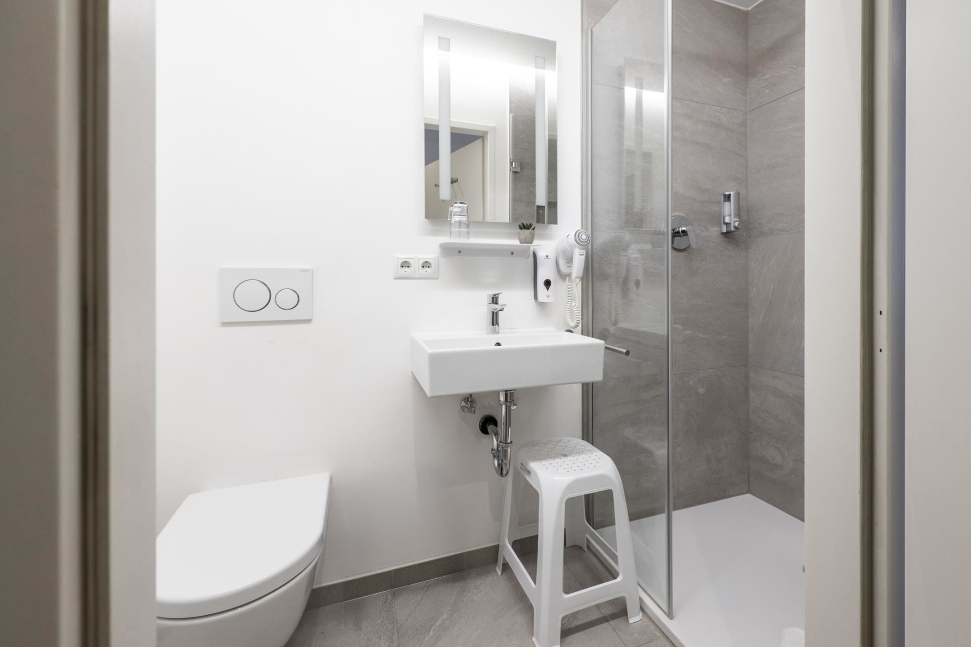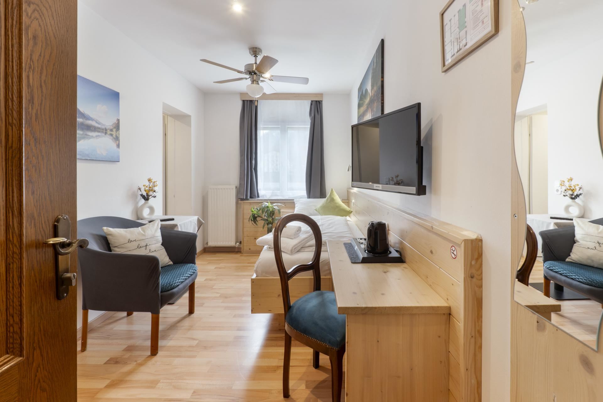 Our single rooms are approx. 15 m2, with a friendly wooden floor, central heating, equipped with a shower/WC, hairdryer, toilet paper and articles, SAT-TV/radio, and a desk.