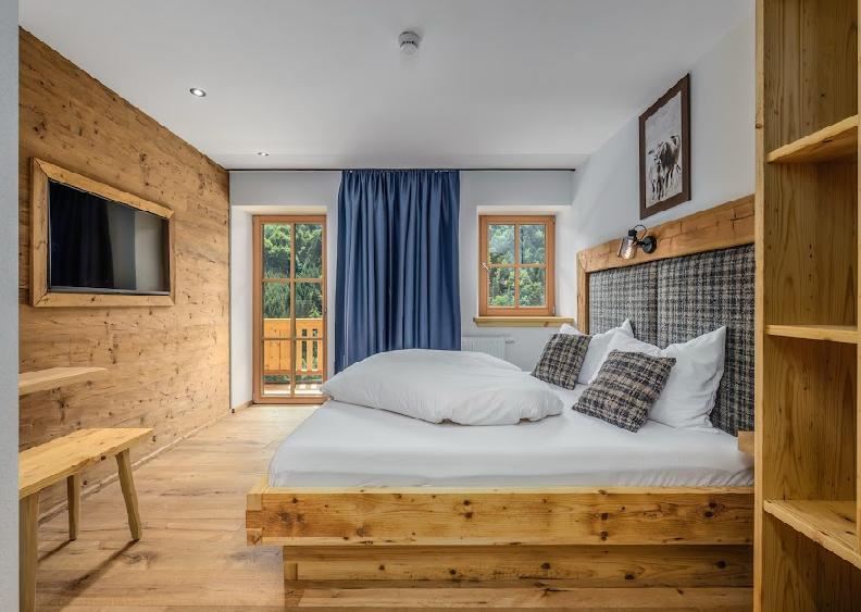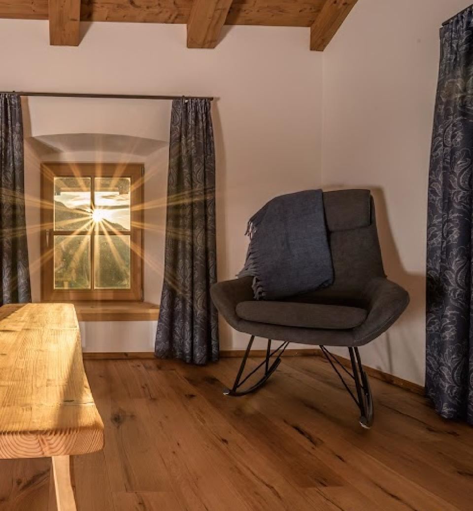 The room is located on the 2nd floor of our organic mountain farm, which we have lovingly renovated. Furnished in alpine style with modern living comfort. The room includes a shower, WC, TV, and a south-facing balcony. The furnishings are made from reclaimed wood and other natural materials. Your stay in our rooms includes a rich breakfast. The cozy breakfast room also invites you to linger in the afternoon, where you can get coffee, tea, and other beverages for a fee. The sun terrace and the garden also offer comfortable spots for relaxation. On request and for an additional charge, the use of the hot tub in the garden is possible.