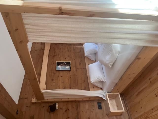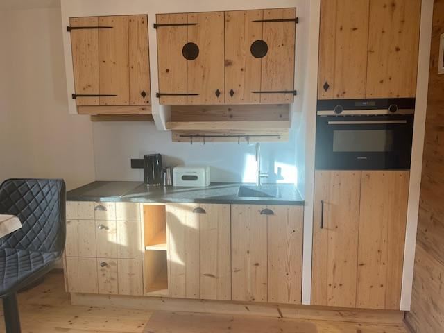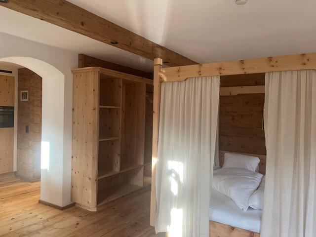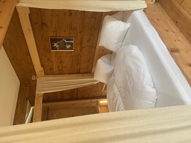 Our studio Zierbennest offers genuine moments of deceleration. You can feel it as soon as you enter, and above all, you are enveloped by the scent of Swiss pine wood. The bedroom features a handcrafted four-poster bed made of Swiss pine, perfect for dreaming. A cozy kitchen made of reclaimed wood, fully equipped, and a bathroom provide space for 2 people. The alpine-style design with wood and other natural materials makes you feel comfortable right away. Everything is completed by an impressive view that can be enjoyed from the balcony.