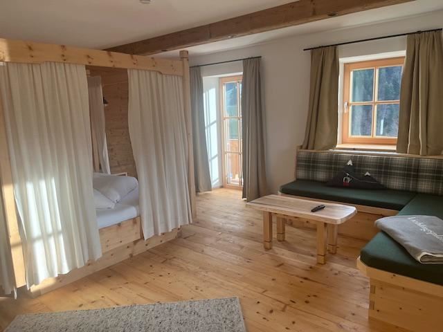 The rooms are on the first floor and on the upper floor of our organic moutain farm, wich we have lovingly renovated. It is furisched in alpine charme and modern living comfort. The room has a comfortable double bed, shower and toilet, and accesess to the south facing balcony. The furnischings are made of old wood and other suitable natural materials. Your stay in our room includes a rich breakfast. The cozy brakfast room also invites you to linger in the afternoon. Here you can get coffee, tea, drinks, and cake for a fee. The sun terrace and the garden also offer cozy places to relaxe. The hot pot can be used on request and for an additional charge.